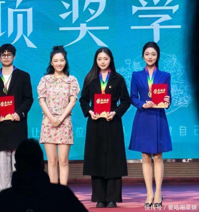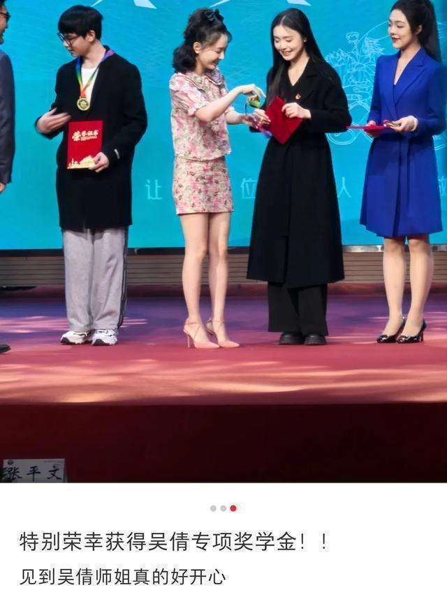 在武大的奖学金颁奖仪式上,吴倩那形象真的是让人眼前一亮。她穿着一身花色套装小裙,站在那里就像一朵盛开的花朵。她给获奖的学生颁奖的时候,那种亲和力是从骨子里散发出来的。她半扎的丸子头特别可爱,虽然已经三十多岁了,但是站在二十左右的大学生中间,竟然显得比他们还显嫩呢。而且啊,她整个人散发着一种成熟和豁达的气质。这和她之前刚出道的时候可太不一样了。